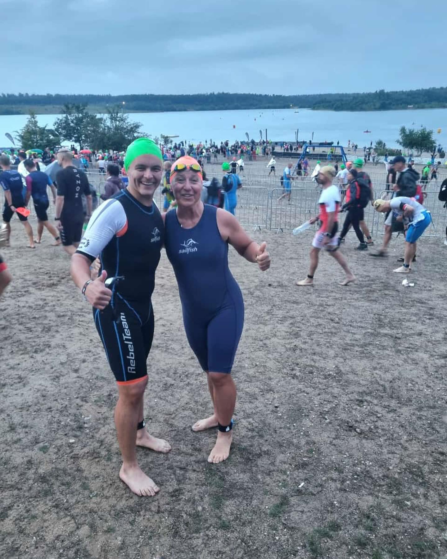 Schon früh am Morgen, als der Regen leise auf die Wasseroberfläche des Langener Waldsees trommelte, standen die beiden Athleten gespannt an der Startlinie. Eine Stunde vor dem Start wurde nochmal die Wassertemperatur bekanntgegeben. Es hieß bei über 26°C Badewannentemperatur Neoprenverbot. Die Aufregung deutlich spürbar machten sie sich auf den Weg in die Startaufstellung. Goose Bumps – der Isländische Motivationsruf lockert nochmal die Arme und legt die Aufregung.