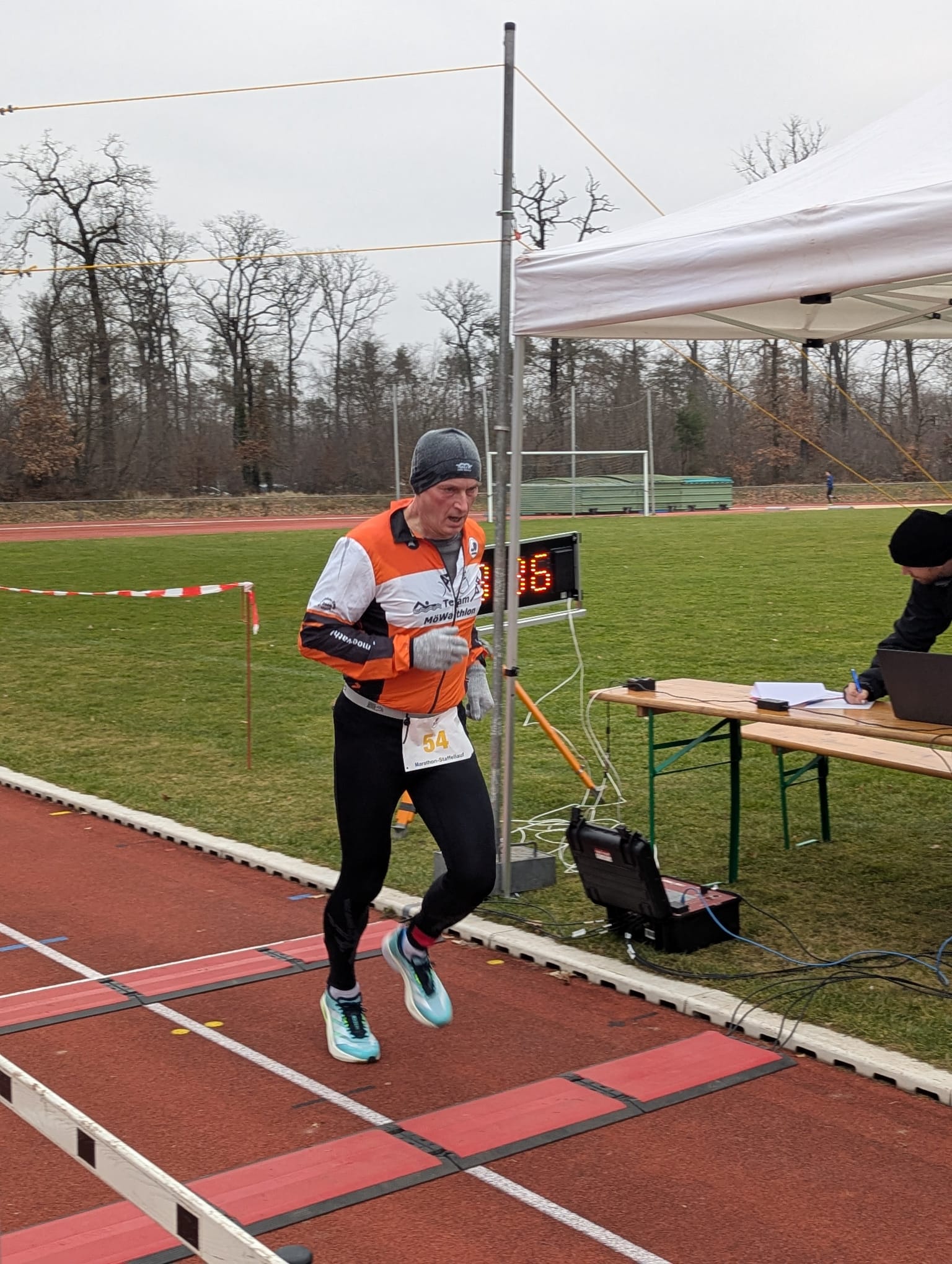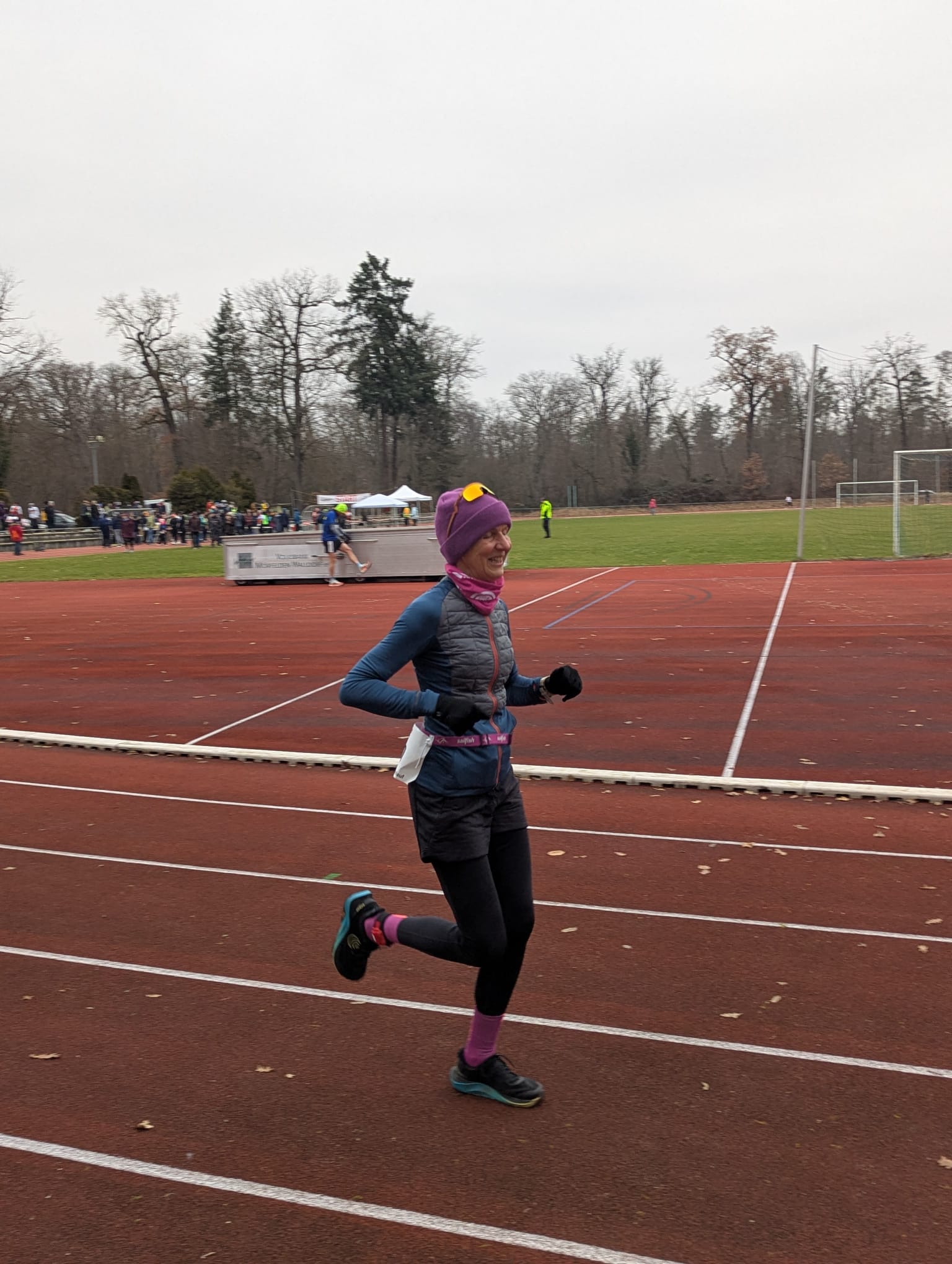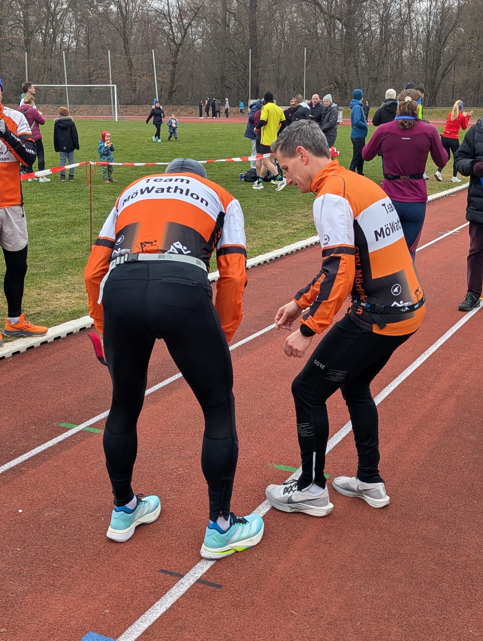 Die Startnummernausgabe begann um 8 Uhr, Startschuss war um 9 Uhr. Aber schon vorher wimmelte es auf der Tartanbahn von AthletInnen, die sich warm machten. Das war auch notwendig bei Temperaturen knapp über dem Gefrierpunkt.