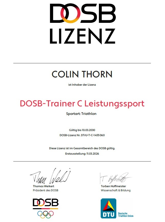 Colins Weg vom Rookie zum Triathlon Trainer hat sich gelohnt. Mit viel Engagement und Elan hat er die Voraussetzungen für den Triathlon Trainerschein erfüllt. Hospitationen, Blockunterricht beim HTV, DLRG Schein Silber, Ausarbeitung einer Präsentation als Abschlussarbeit, Prüfung ….