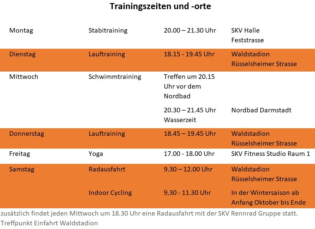 Für die ‚Schönwetterfahrer‘ bieten wir von Anfang Oktober bis Ende März samstags von 9.30 – 11.30 Uhr Indoor Cycling im SKV Fitness Studio an. Wer will kann daraus ein Koppeltraining machen und noch max. eine Stunde im Anschluss laufen.